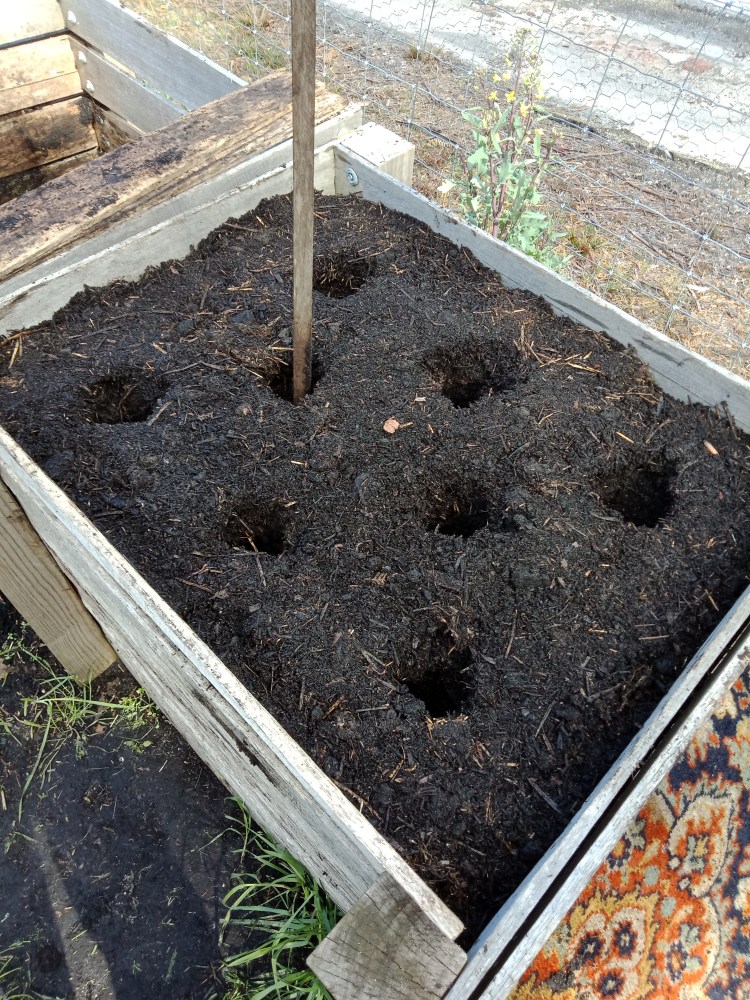 Back to composting, once the pile is built we aerate it by poking holes in it with a garden stake all the way to the bottom. This is to ensure it doesn’t become anaerobic. If your compost is slimy or smells bad it means that is needs oxygen, hence the air holes. Make sure you do the air holes each time you turn. Then we cover it with a piece of Persian carpet cut to fit the bins. If you don’t have Persian carpet I am sure any carpet will do.