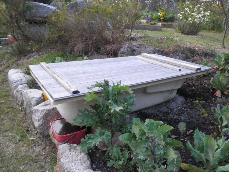 The worm farm is in an old bathtub. The worm wee comes out the plughole into a bucket so it can be diluted and watered on the garden. The castings (that’s a scientific word for worm poop), can be removed when it’s full and either added to the compost of dug into a bed.