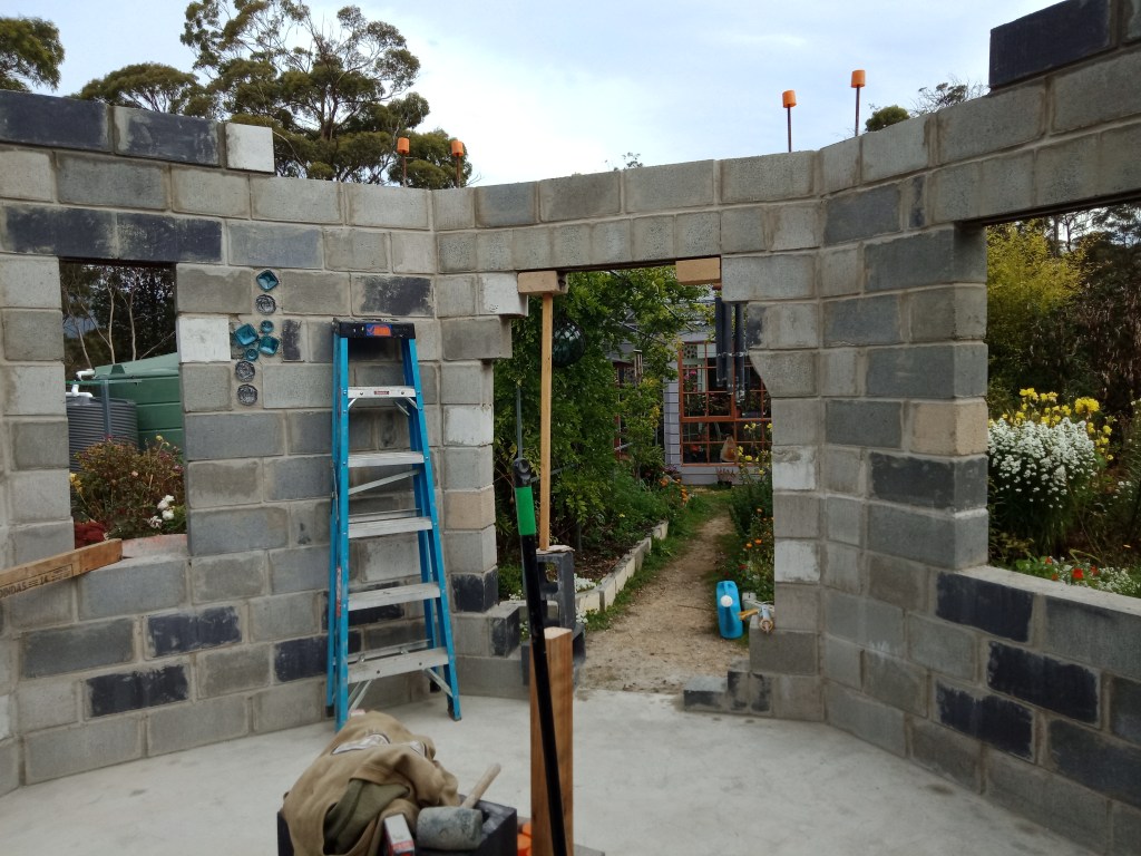 We commenced building Bryon’s studio in March 2020 at the beginning of lockdown. The building is octagonal of course, our favourite shape for buildings. It is erected on a concrete slab, with block walls the are filled with concrete and reinforced with steel rebar. We had a working bee to pour the slab and were helped by four good friends, thanks to Rick, Rachel, Peter and Karen. It took sixty mixes to complete and was done in four hours, that’s a lot of shoveling! The bricklaying was a tedious job and took us a day to lay each course by the time we’d back filled it with concrete and made the beams to go over the openings.