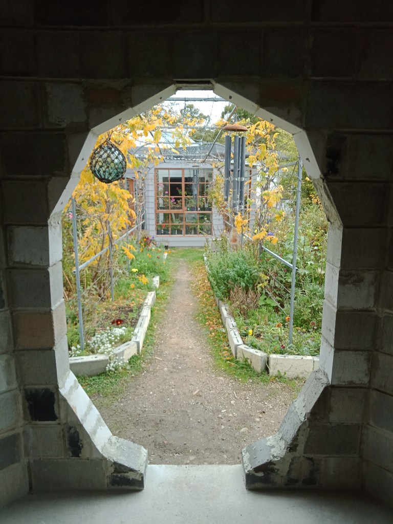 We have used some bottles to add highlights to the walls, and painted out the inside with a bright white paint as we wanted to maximise the light for Bryon when he is painting. Of course we have been so busy for the past 12 months he’s hardly had any time to paint. The building nestles nicely in the garden and is approached by a tunnel of wisteria from the conservatory. Which of course is bare in winter, lush green in summer and golden during the autumn
